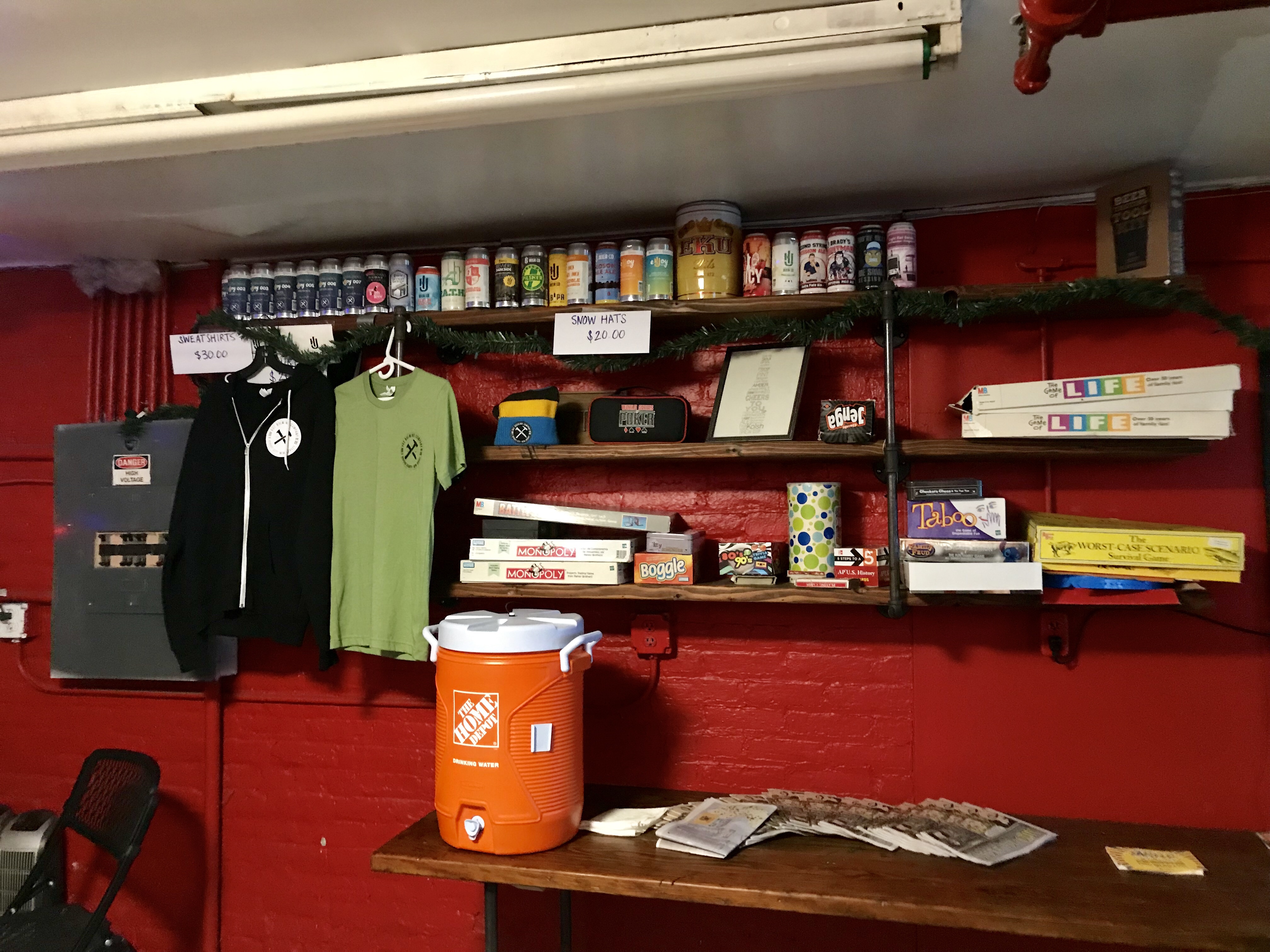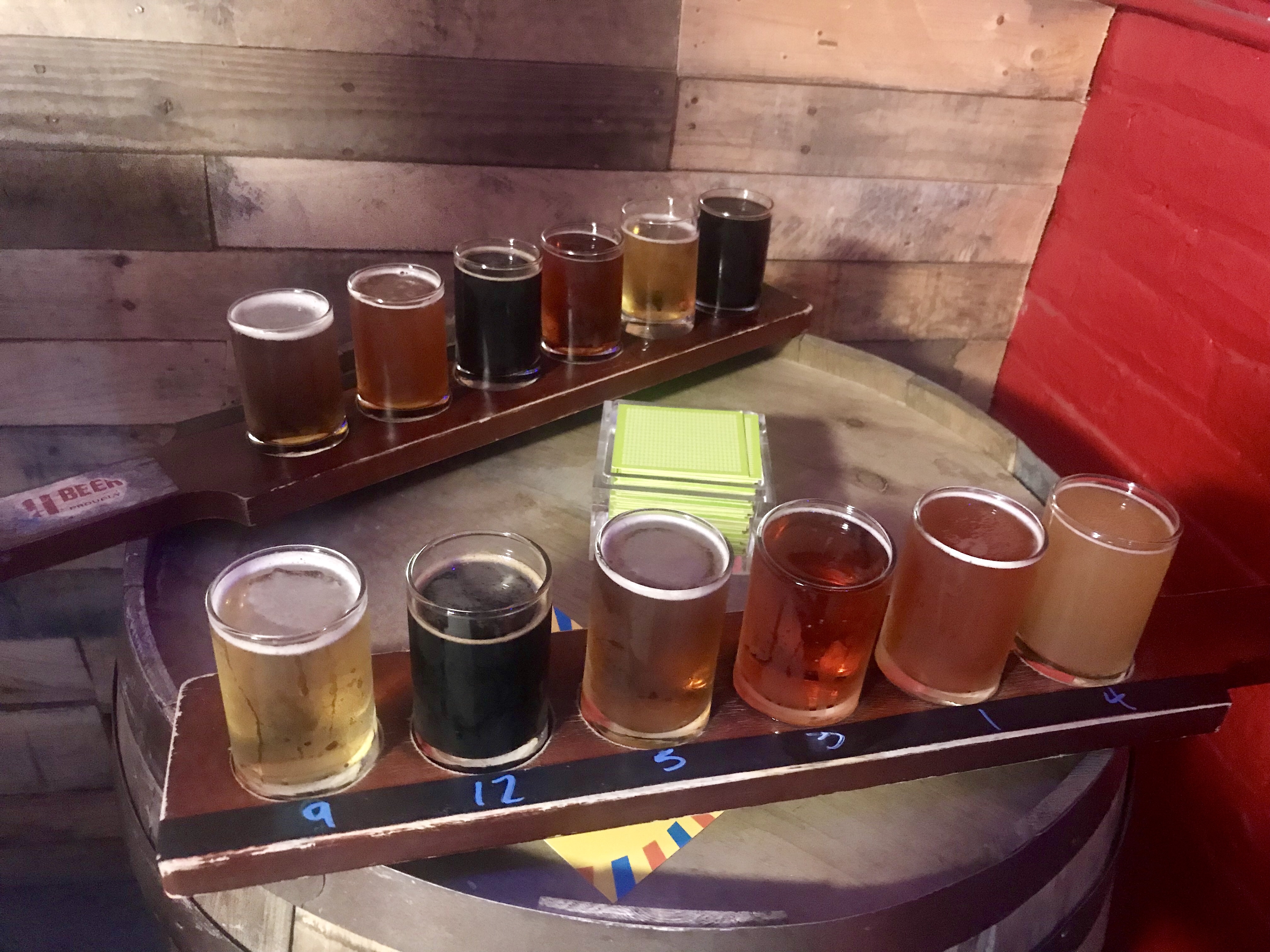 There were 12 different craft beers to choose from in this half brewery half tasting room warehouse. You could purchase a flight, pint, growler, individual cans and 6 packs. The beer names were hip and area related.